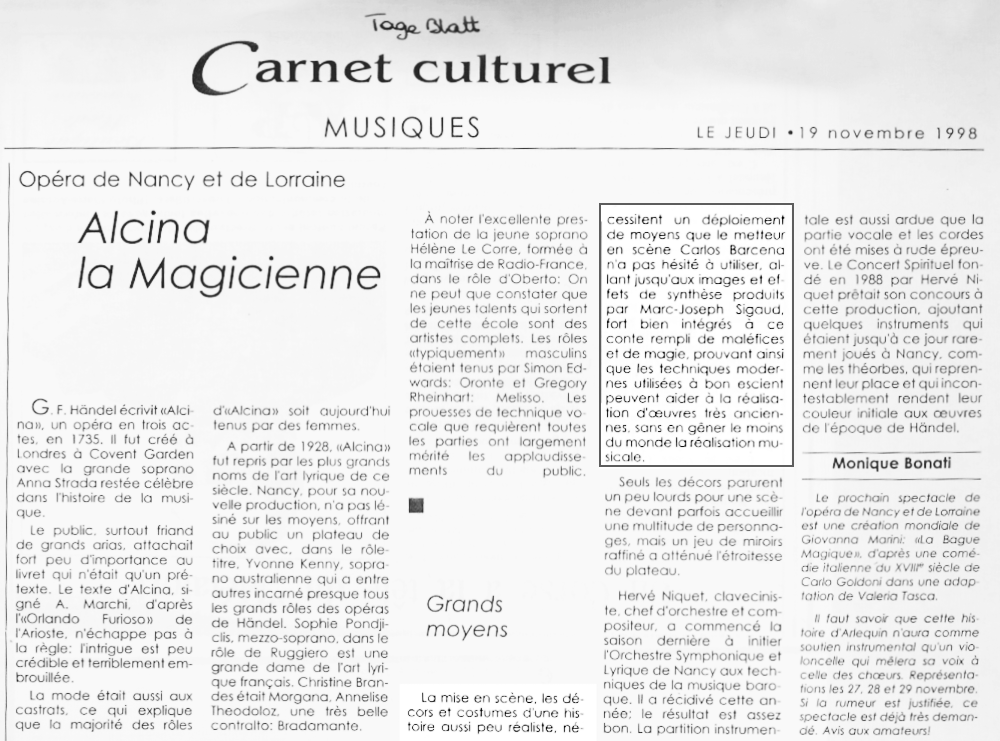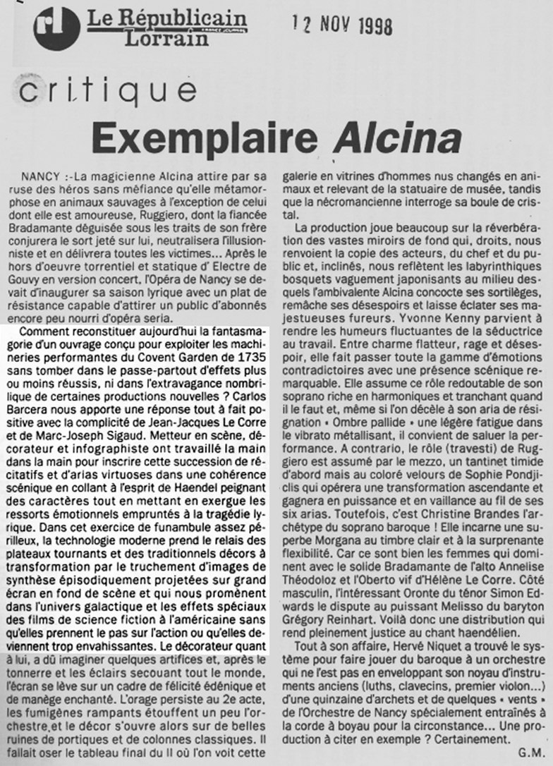15 Déc 1998 Presse Vidéo Opéra Alcina 1998 de wpoct2022 | Posté dans : presse | 0 Réalisation de Marc Joseph SIGAUD du décor virtuel de l’Opéra Alcina de Haendel au grand Théâtre de Nancy . Une première !
